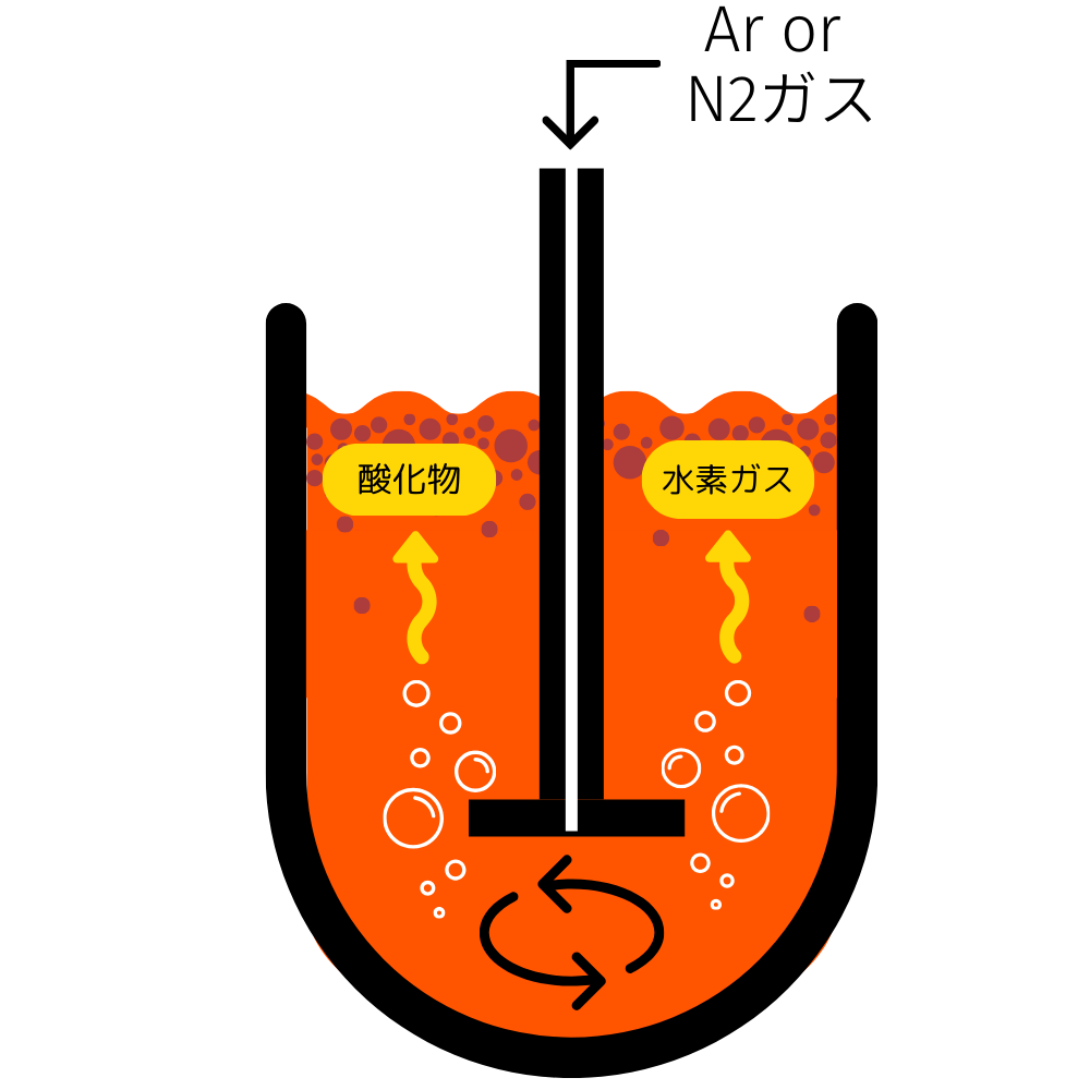 この気泡が溶融金属の中を上昇する過程で、水素ガスや微細な酸化物を巻き込みながら表面へ移動し、これらの不純物が排出されます。